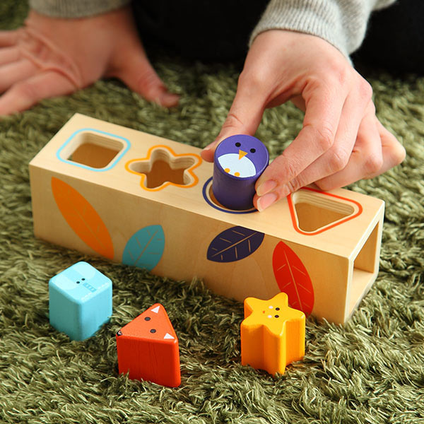 丸、三角、四角、星型の4つのブロックを同じ形の穴にはめて遊びます。楽しく遊びながら色や形を学ぶことができます。木の温かみを感じるおもちゃです。