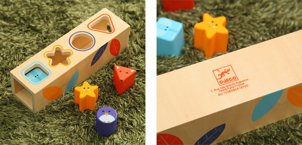 ●丸、三角、四角、星型の4つのブロックを同じ形の穴にはめて遊ぶおもちゃです。
