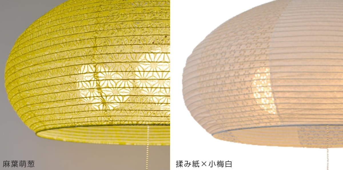 灯りを付けると柄がやさしく浮かび上がります。麻の葉模様の和紙を使用した鮮やかな抹茶色の【麻葉萌葱】、揉み紙と可愛らしい小梅柄の和紙を合わせた【揉み紙×小梅白】からお選びいただけます。