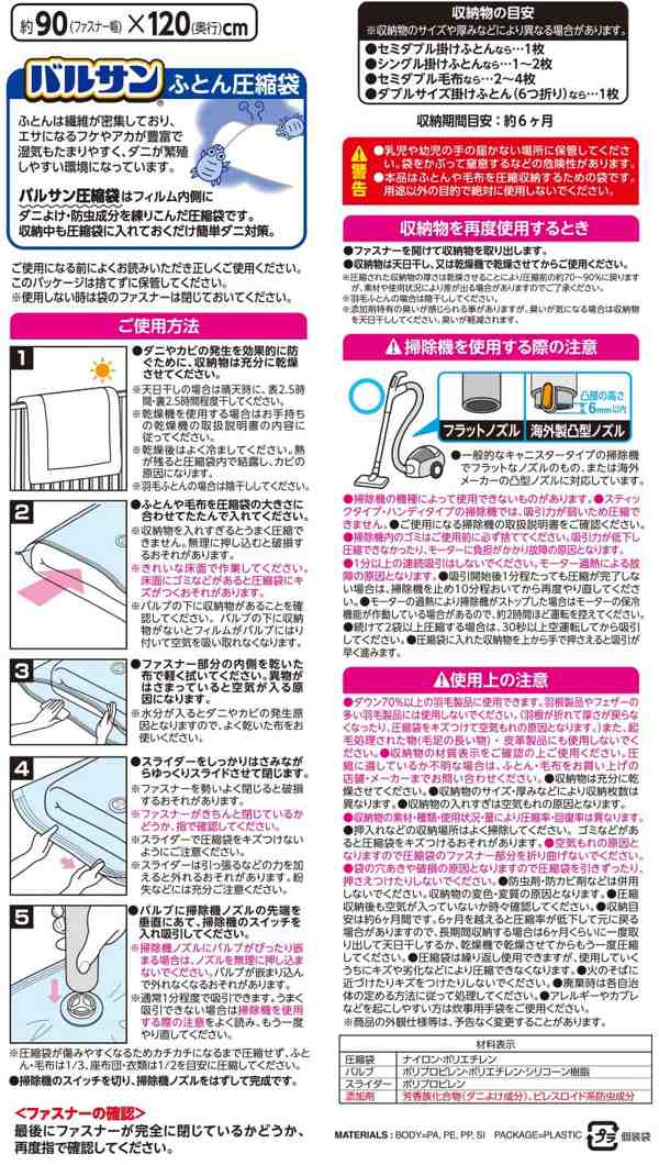 | 材質 | 圧縮袋:ナイロン、ポリエチレン バルブ:ポリプロピレン、ポリエチレン、シリコーン樹脂 スライダー:ポリプロピレン 添加剤:芳香族化合物(ダニよけ成分)、ピレスロイド系防虫成分 |