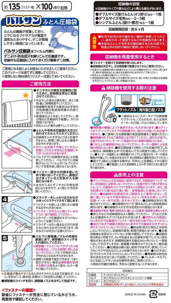 | 材質 | 圧縮袋:ナイロン、ポリエチレン バルブ:ポリプロピレン、ポリエチレン、シリコーン樹脂 スライダー:ポリプロピレン 添加剤:芳香族化合物(ダニよけ成分)、ピレスロイド系防虫成分 |