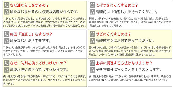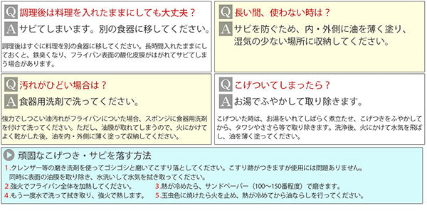 | 備考 | ※空焼き・油ならし不要 ※最初に使用する際は食器用洗剤で洗ってください。 ※業務用熱源で高出力タイプのものは変形の可能性がありますので、おやめください。 |