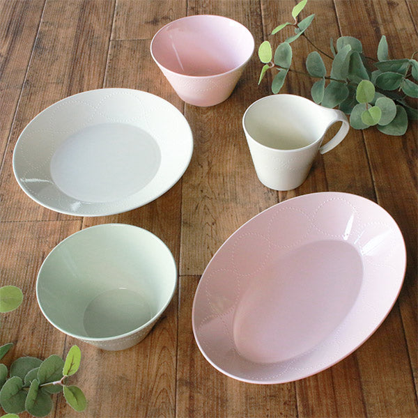 優しいペールカラーにドット模様のエンボス加工がアクセントの「プンティーノ」シリーズ。日本三大漆器のひとつ「山中漆」の産地、石川県で作られており、表面塗装には長年培われてきた漆器の技術が活かされています。爽やかな淡いカラーが毎日の食卓でお料理をそっと引き立ててくれます。