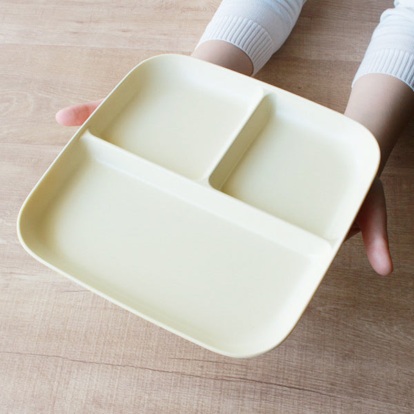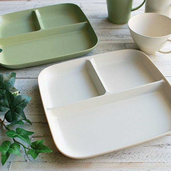 軽くて割れにくい素材で出来ているランチプレートです。朝食にはサラダとパン、目玉焼きを盛り付けてモーニングプレートに。夕食には大皿から取り分ける仕切り皿としてなど、幅広く使えます。程よい深さの仕切りがあるので、ソースやドレッシングが混ざりにくいです。