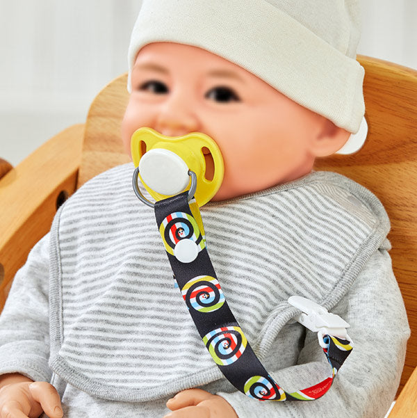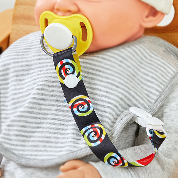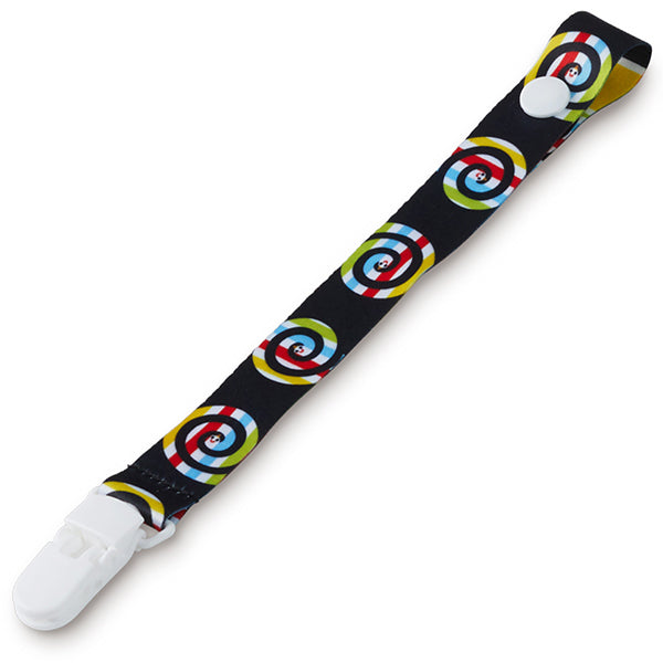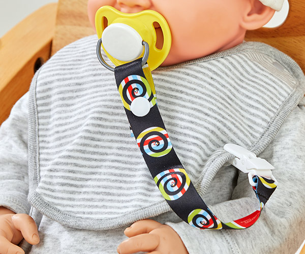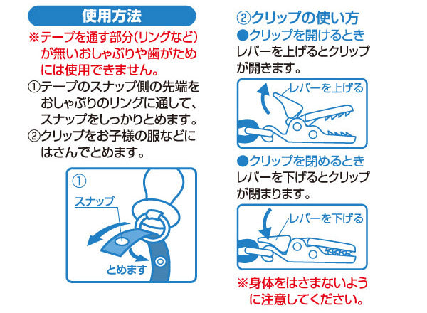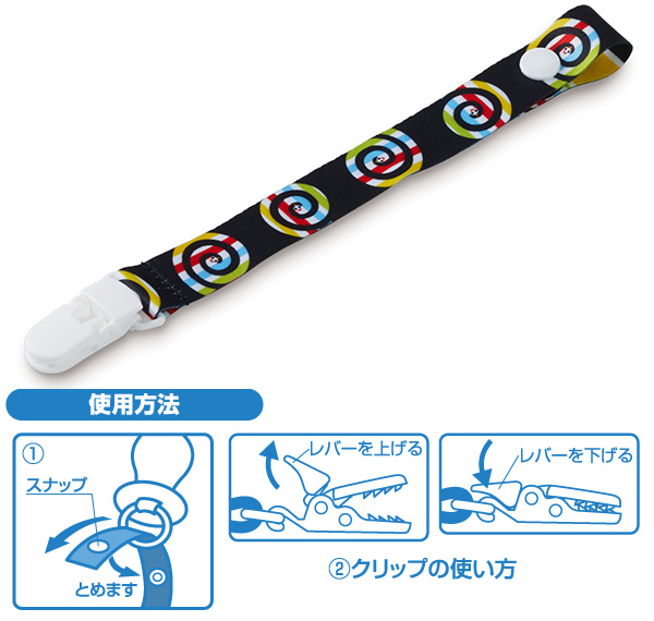 片側をおしゃぶりに通してスナップボタンで留めます。もう片側はレバーを上げ下げしてクリップで挟むだけで簡単に取り付けができます。