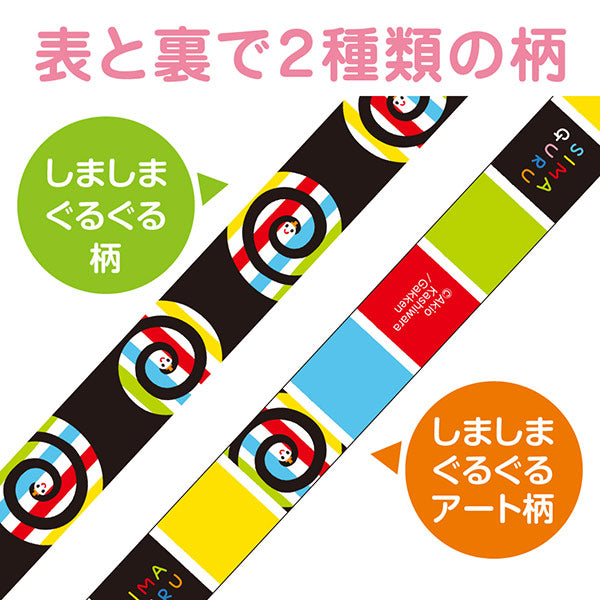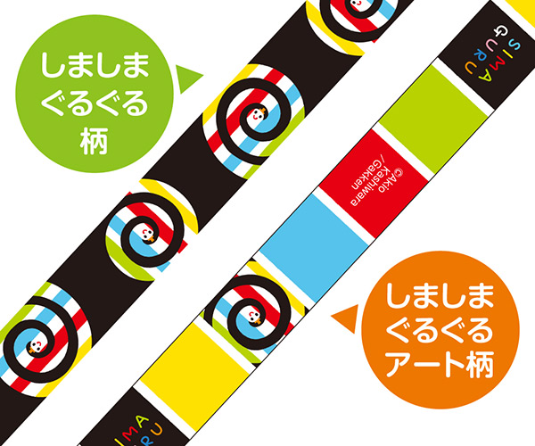 表面はしましまぐるぐる柄、裏面は絵本「しましまぐるぐる」の表紙の絵などが入ったしましまぐるぐるアート柄です。