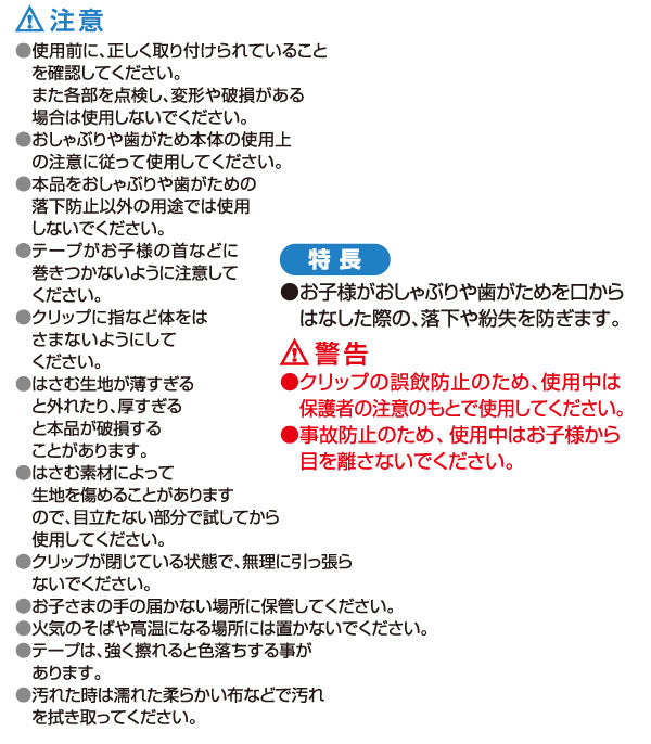 | 注意事項 | テープを通す部分(リングなど)がない歯がためやおしゃぶりには使用できません |
