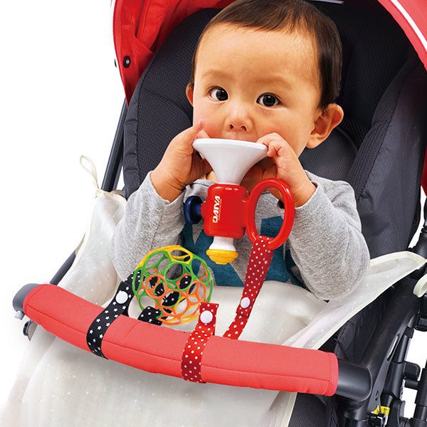●ベビーカーとおもちゃに取り付けるだけ!おもちゃを落としてもベビーカーと繋がっているので、紛失する心配がありません。