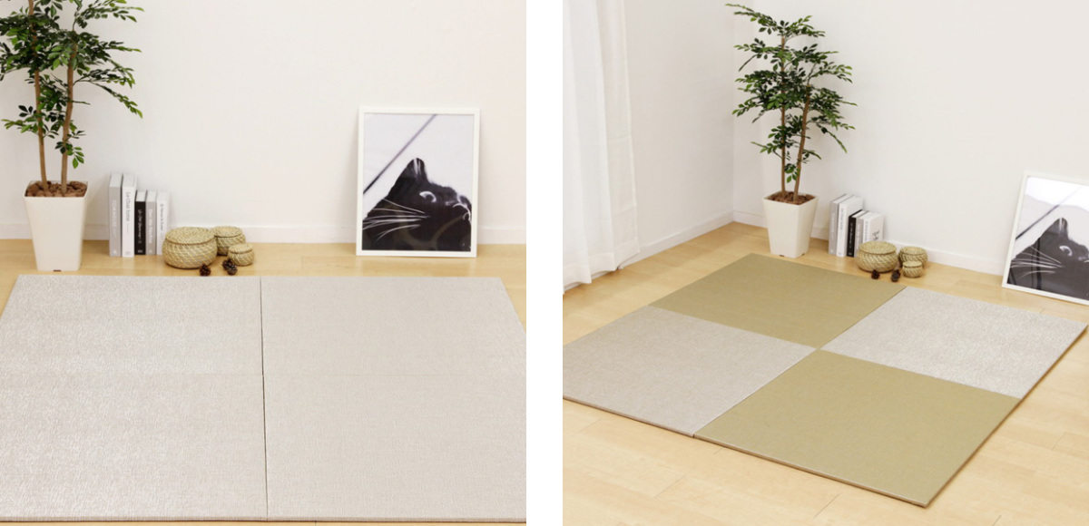 置き畳を目の方向を変えて敷くと、光の加減で市松模様のように見えるのでバリエーションが増えます。