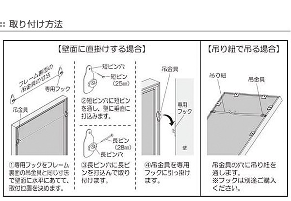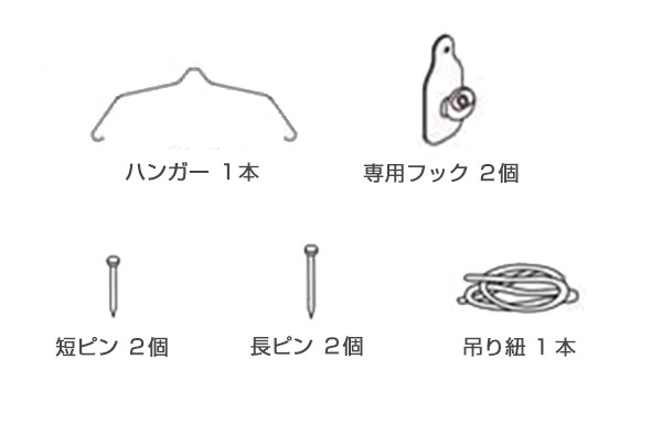 ハンガー×1、専用フック×2、短ピン×2、長ピン×2、吊り紐×1が付いています。