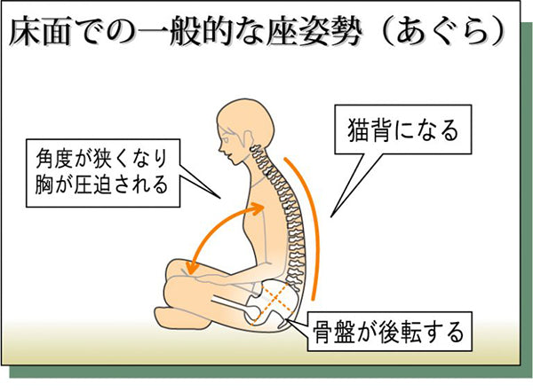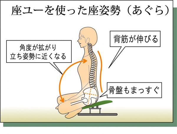 ●あぐら座位は身体への負担が大きくなりやすい姿勢ですが、座ユーを介してあぐらをかくと座面が大きく前傾して骨盤を支え背筋が伸び身体への負荷が軽減されます。