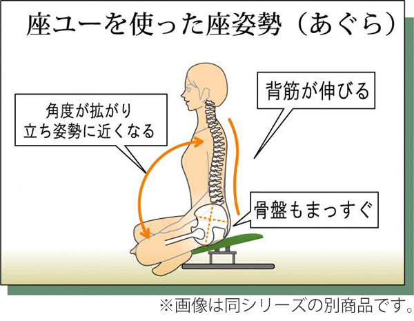 座面下に組込んだ弾性体の作用により、座った時の動きに合わせて前後左右に座面が動きます。とくにあぐら座位は骨盤が後転し背骨が曲がり腰や内臓への負担が大きくなりやすい姿勢ですが、座ユーを介してあぐらをかくと座面が大きく前傾して骨盤を支え背筋が伸び、立っている時のような自然な姿勢となりお体への負荷が軽減されます。