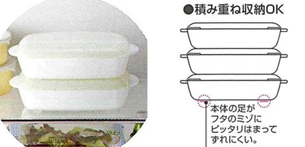本体の脚と蓋の溝がぴったり合うので重ねてもずれにくく、冷蔵庫の中でも場所を取りません。