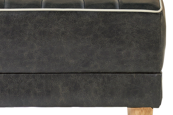 張地にはヴィンテージ風のブラックPVCレザーを用い、ホワイトのパイピングでデザイン全体を引き締めています。