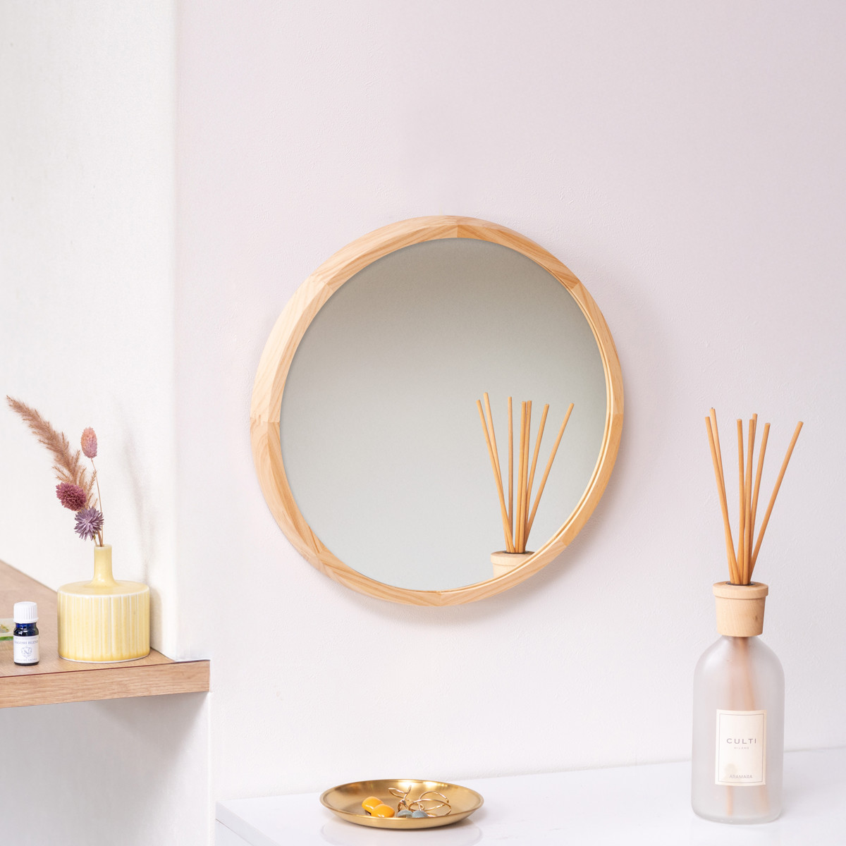 丸いフレームのデザインがお部屋を柔らかな雰囲気に包んでくれます。木の温もりを感じられるナチュラルな印象でお部屋のインテリアにも自然に馴染む壁掛けミラーです。