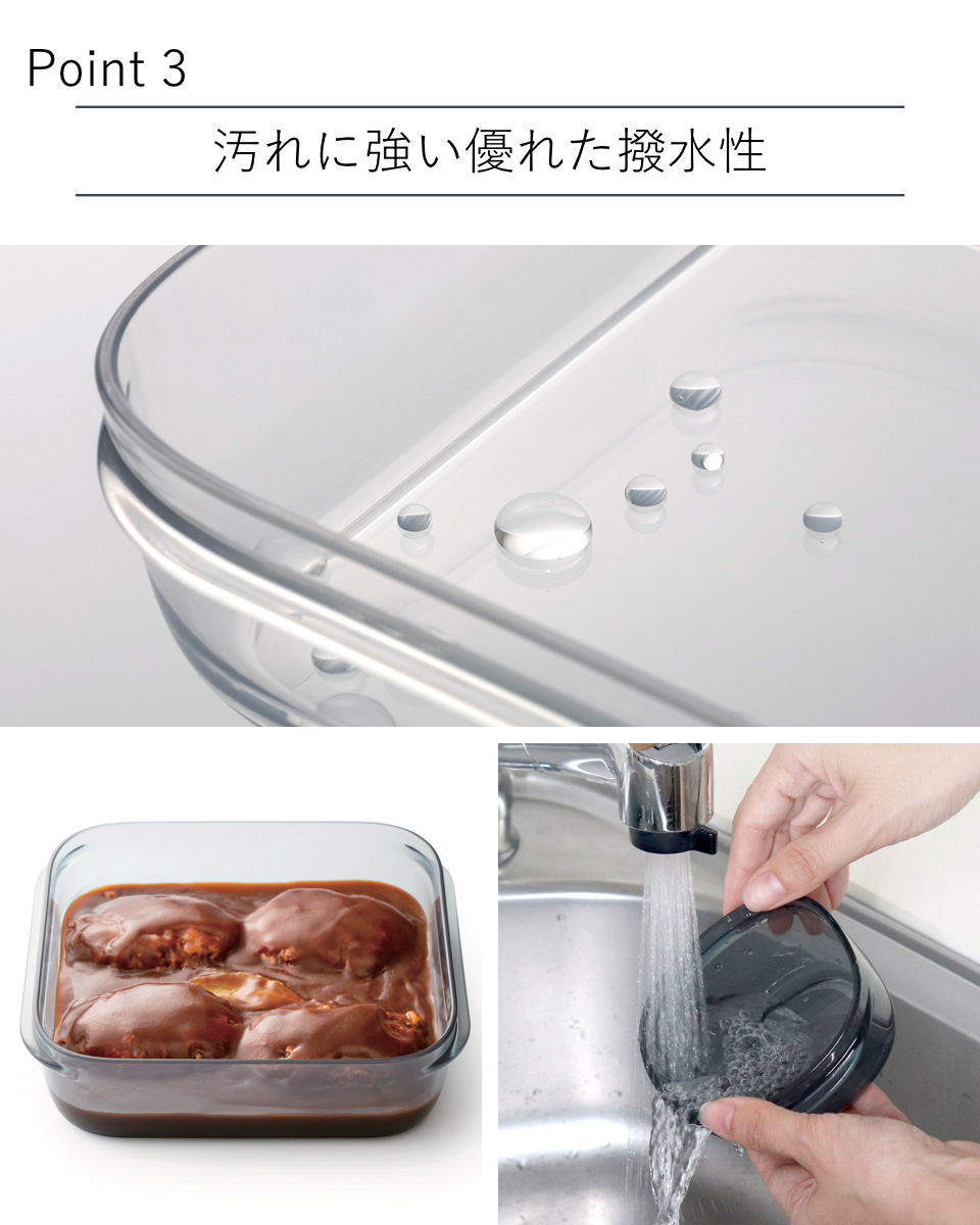 撥水性に優れた素材を使用しているので、食品からの色移りや汚れ、においが付きにくいです。カレーやシチュー、トマトソース系の色の濃い料理も安心。サッと洗うだけで汚れもヌメリも残らず、清潔に保ちやすいです。