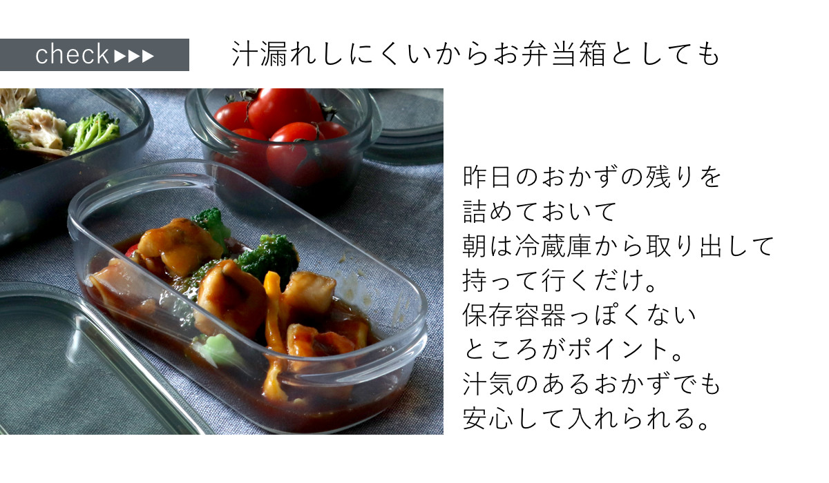 フタにはパッキンが付いているので密閉性が高く、汁気のある物も保存が可能です。液体やにおいの漏れを軽減してくれます。