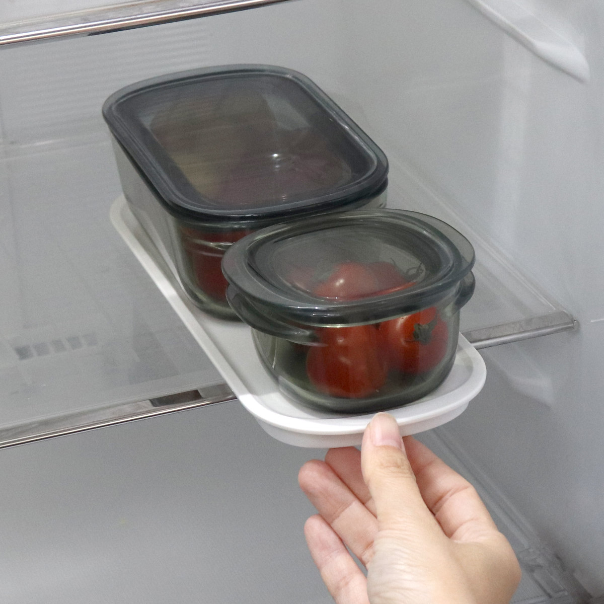 保存容器がピッタリ収まるシリーズ専用トレー(別売)。保存容器をのせておけば、冷蔵庫からまとめて取り出したり、食卓に並べたりが手軽に。より冷蔵庫の整頓がしやすくなります。