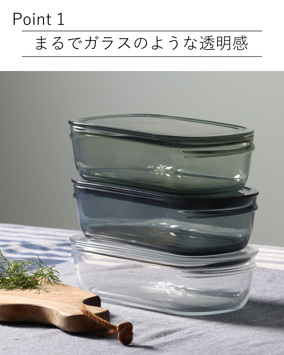 透き通ったガラスのような見た目が魅力的。でもガラス製ではなく樹脂製なので、軽くて割れにくいです。日々使うアイテムだからこそ、使いやすさはとても重要。ガラス製よりも扱いやすく、気兼ねなく使うことができます。さらに、フタも側面も透明で中身がひと目で分かるのも嬉しいポイントです。
