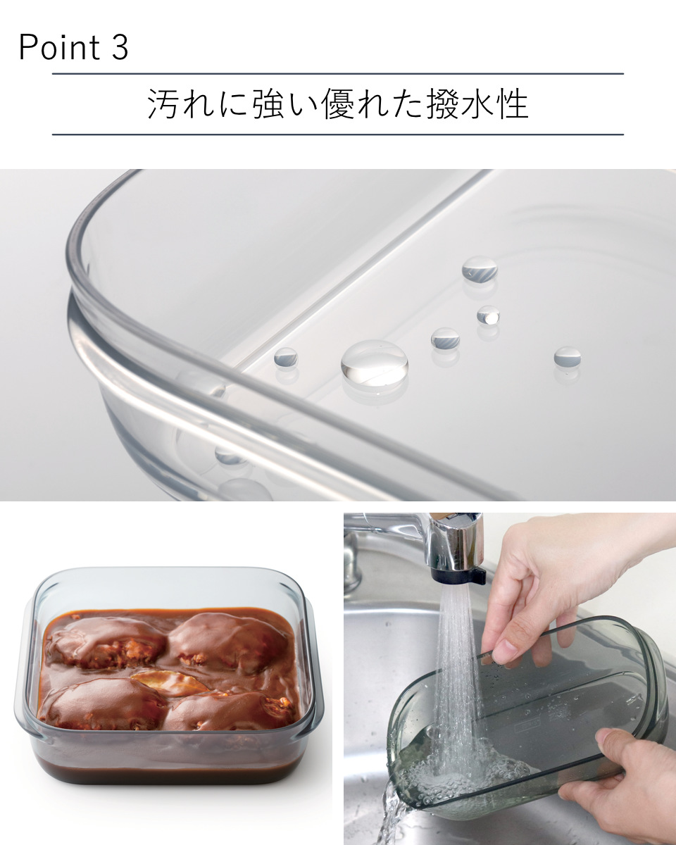 撥水性に優れた素材を使用しているので、食品からの色移りや汚れ、においが付きにくいです。カレーやシチュー、トマトソース系の色の濃い料理も安心。サッと洗うだけで汚れもヌメリも残らず、清潔に保ちやすいです。