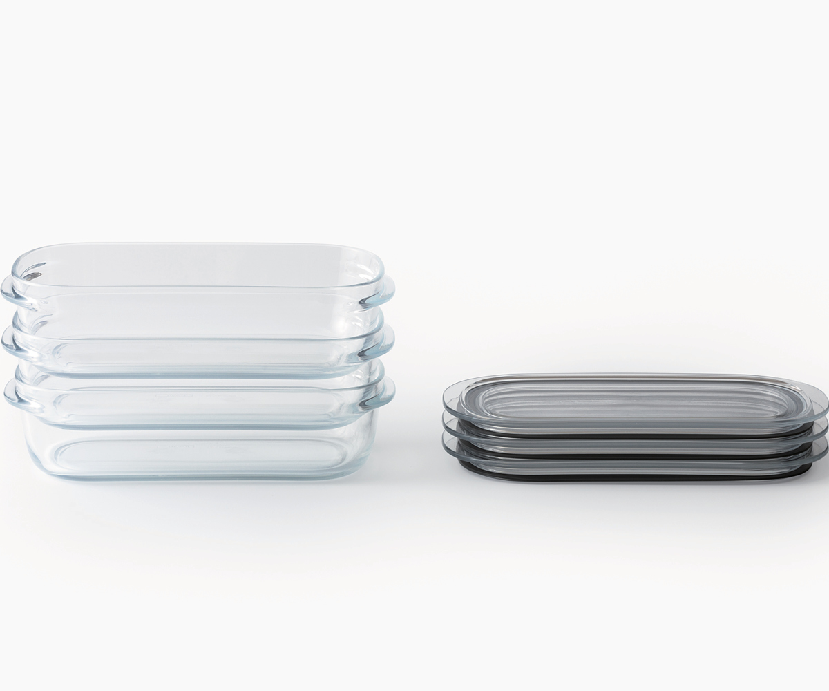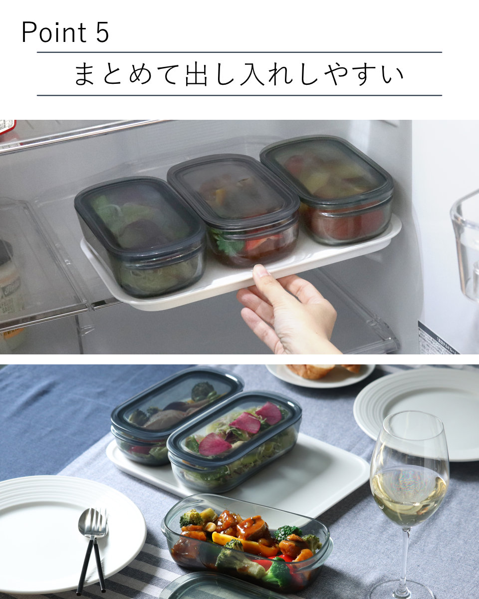トレーにはセットの保存容器がちょうど収まります。トレーに保存容器をのせておけば、冷蔵庫からまとめて取り出したり、食卓に並べたりが手軽にできます。また、冷蔵庫内の空間を無駄なく有効活用でき、すっきりと整理整頓ができます。