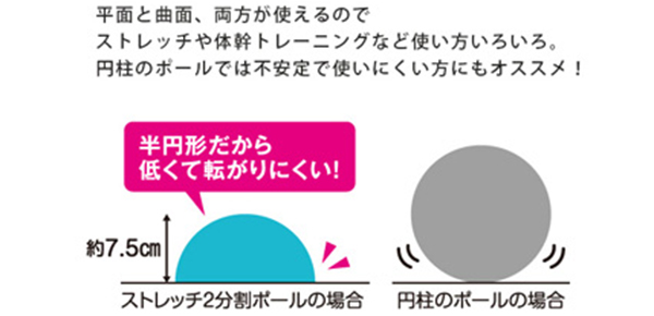 低くて転がりにくい半円形なので平面を下にすれば安定感があり、一般的な円柱ポールと比べてストレッチがしやすくなります。円柱のポールでは不安定で使いにくい方にもオススメです。