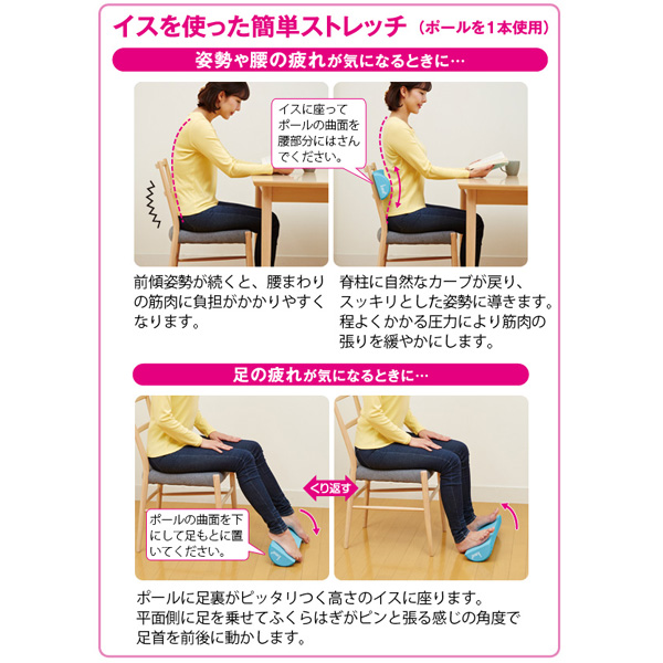 姿勢や腰、足の疲れなどが気になる時にも椅子を使って1本でもストレッチが出来ます。テレビを見ながら、読書をしながらなどのリラックスタイムに気軽に使えます。
