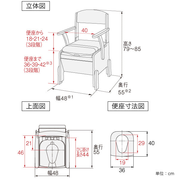●利用者の体格や状況に合わせて、便座高とひじ掛け高が3段階に調節可能です。