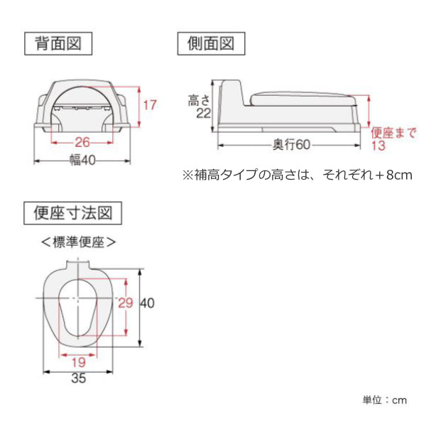 | サイズ | 約 幅40×奥行60×高さ22(cm) (便座までの高さ:13cm) ※補高タイプの高さは、それぞれ+8cm |