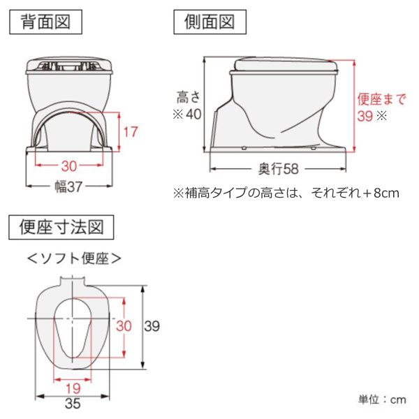 | サイズ | 約 幅37×奥行58×高さ40(cm) (便座までの高さ:39cm) ※補高タイプの高さは、それぞれ+8cm |
