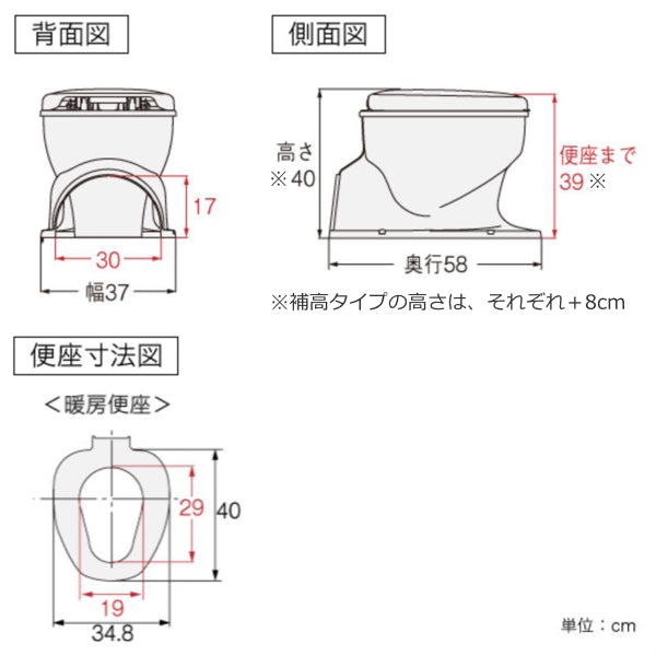 | サイズ | 約 幅37×奥行58×高さ40(cm) (便座までの高さ:39cm) ※補高タイプの高さは、それぞれ+8cm |