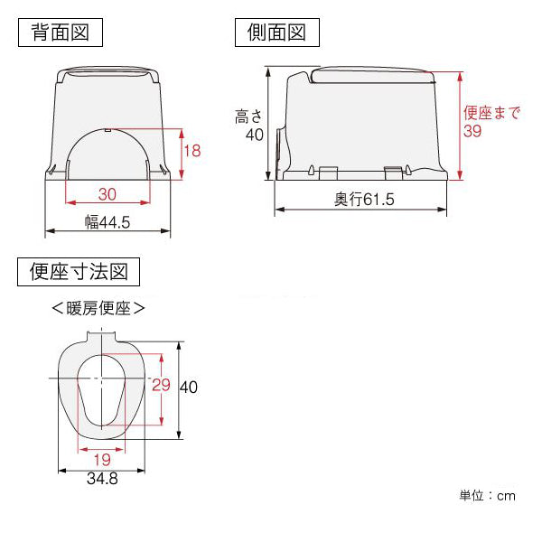 | サイズ | 約 幅44.5×奥行61.5×高さ40(cm) (便座までの高さ:39cm) |