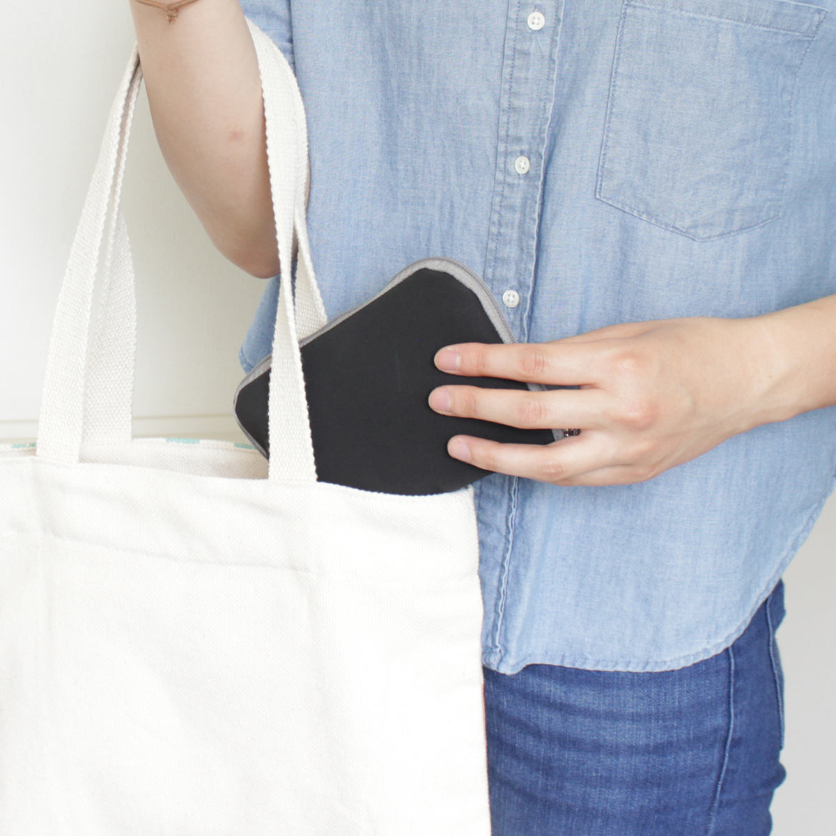 ポーチを広げると大きめサイズのトートバッグになり、履いて来た靴を入れたり、A4サイズの書類が収容できます。