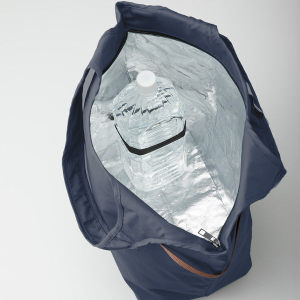 バッグの内側はアルミ蒸着による簡易保冷素材です。ペットボトルや牛乳パックなどを固定できるゴムバンドも付いており、立てたまま持ち帰れます。