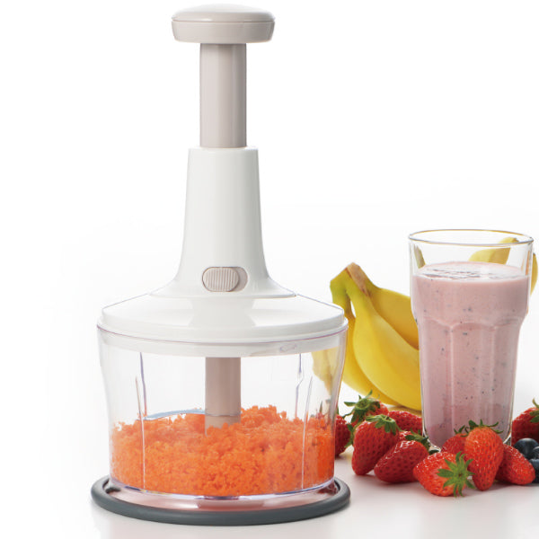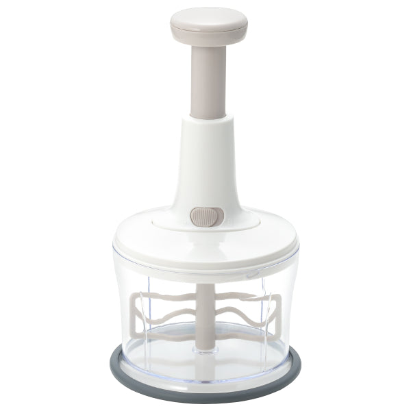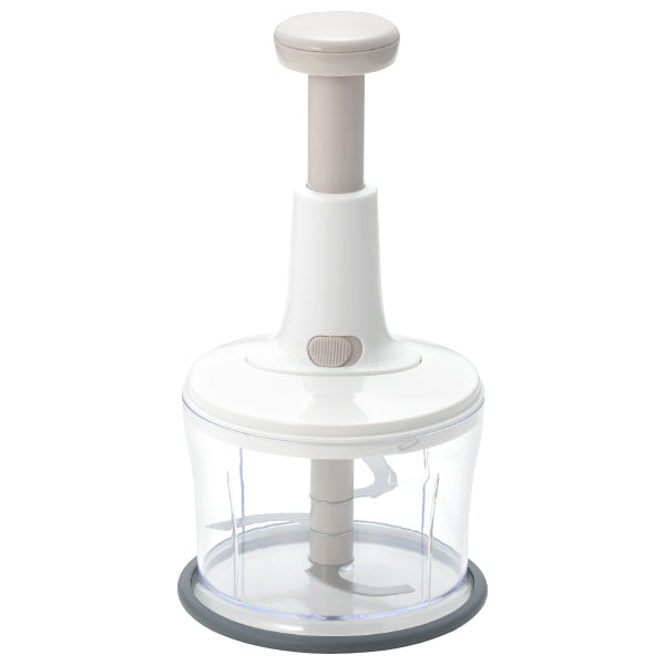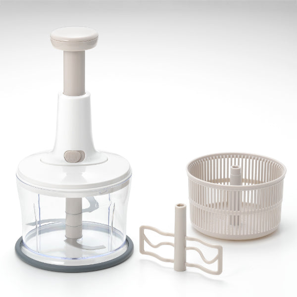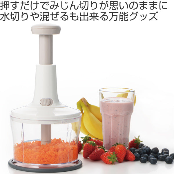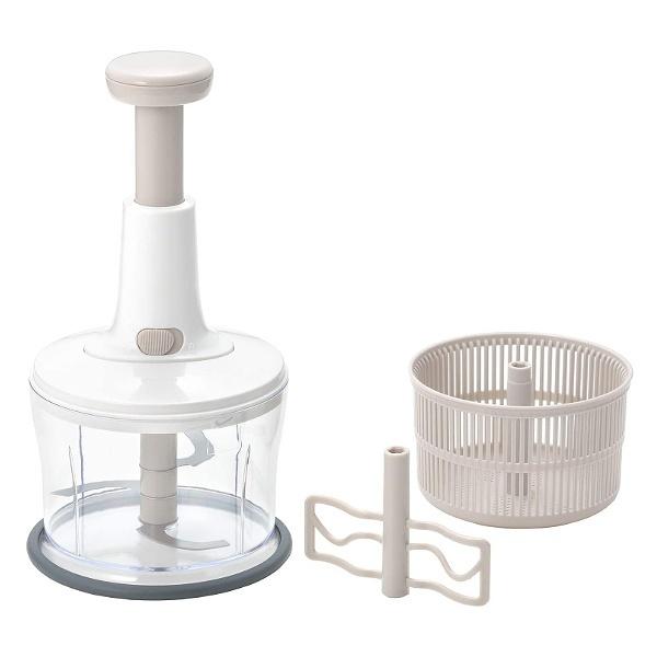 上から押すだけで簡単にみじん切りが出来るフードプロセッサーです。付属の部品を使用すれば、水切り器や泡立て器としてもお使いいただけます。付け替え式なので洗う時も取り外しが出来て、洗いやすいです。