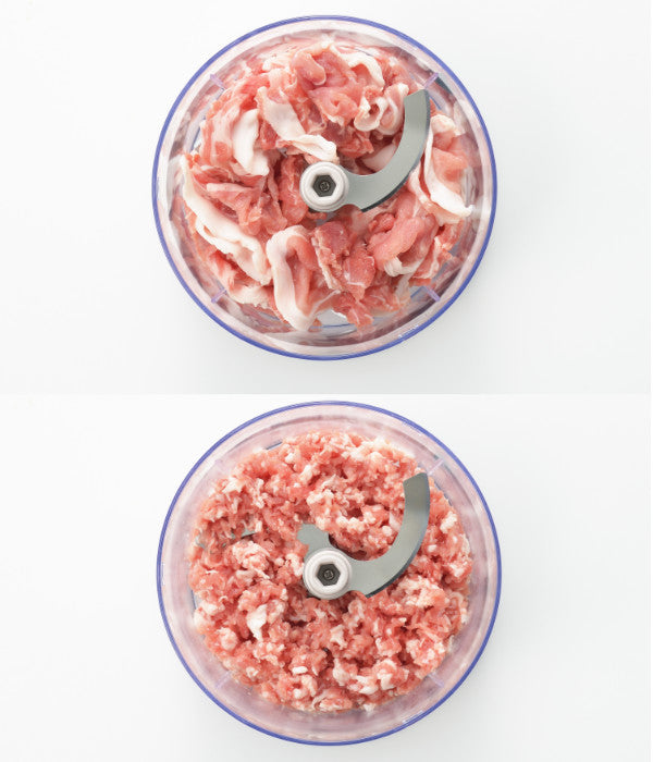 にんじんやピーマン、玉ねぎなどをみじん切りに出来るので包丁で細かく刻む手間が省けます。お肉などはミンチ肉にしてハンバーグや餃子なども作れます。