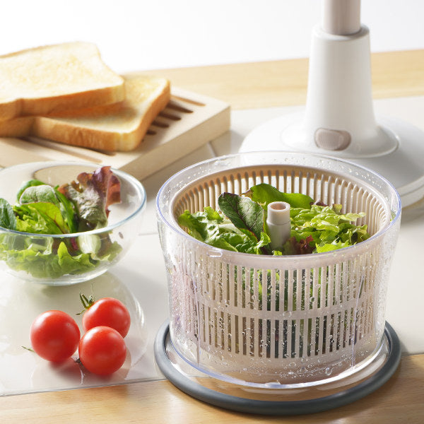 付属の水切りカゴに付け替えればサラダスピナーにも早変わりします。しっかり水切りして、シャキシャキ野菜のサラダが楽しめます。