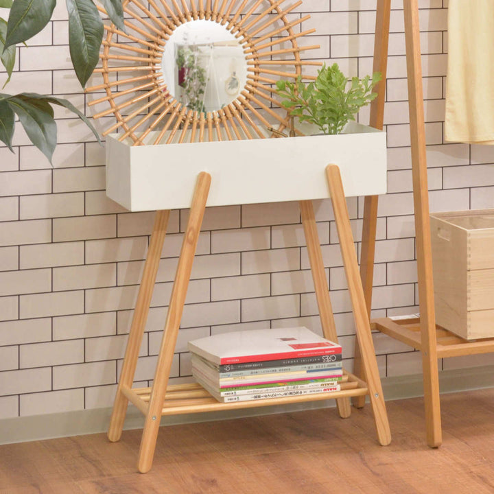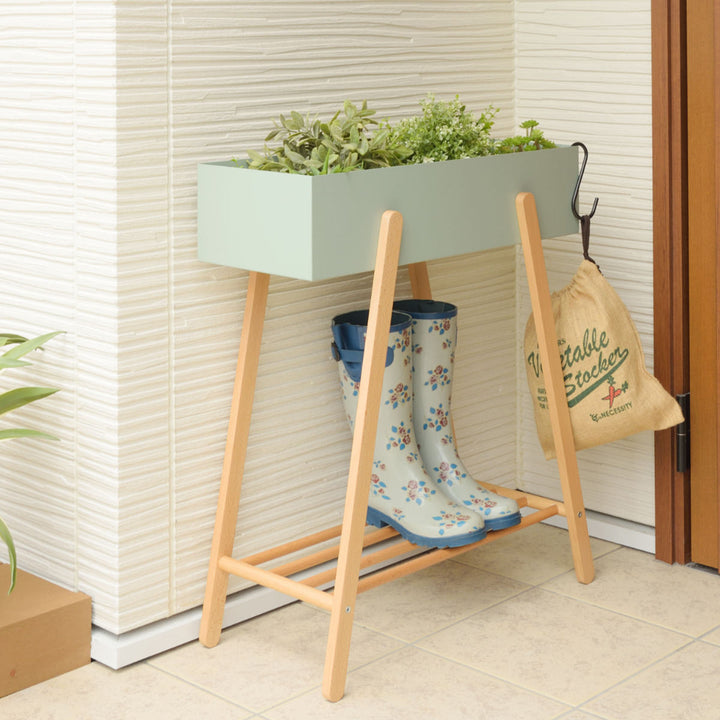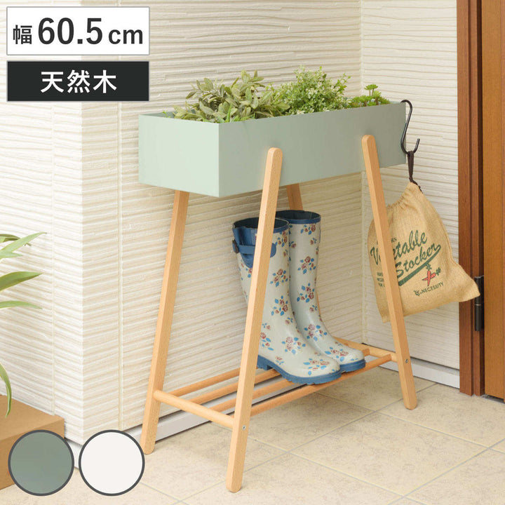 お花や観葉植物を飾ることができるプランター付きの収納棚です。プランター下段には棚板付きなので靴やガーデニング用品などをまとめて収納することができます。手にしっくりと馴染む天然木と優しい色合いのプランターがおしゃれな空間を演出します。