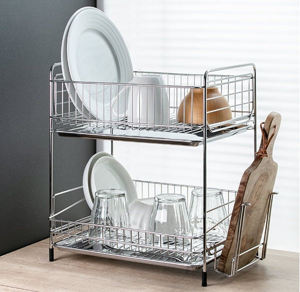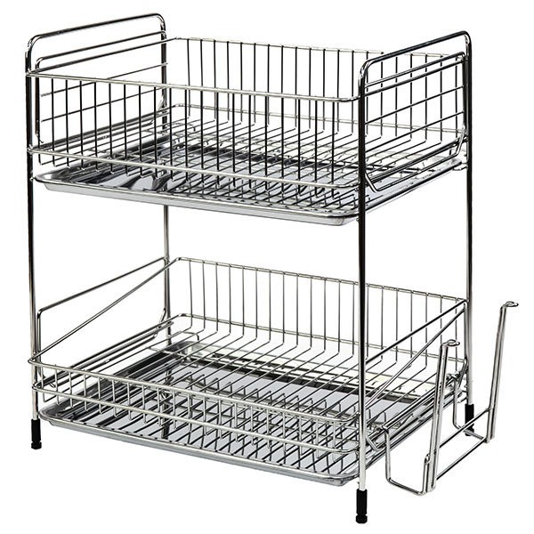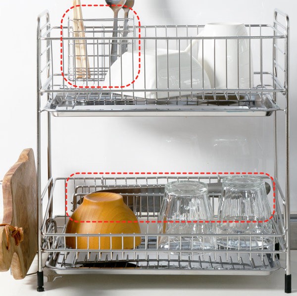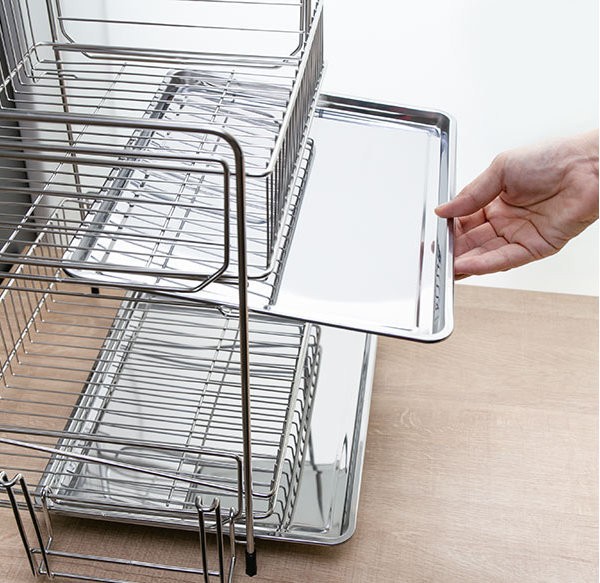 下段だけにトレーが付いている水切りラックが多いのですが、それだと上段に置いた食器の水で下に置いた食器がさらに濡れてしまいます。この商品は、上段・下段どちらにも水受けのトレーが付いているので、下段に置いた食器に上段からの水が掛かりません。食器をおいたままでもトレーは引き出すことができるので、水が溜まってしまった時も安心です。ラックの奥にトレー用のストッパーが付いているので、トレーが奥から滑り落ちる心配もありません。