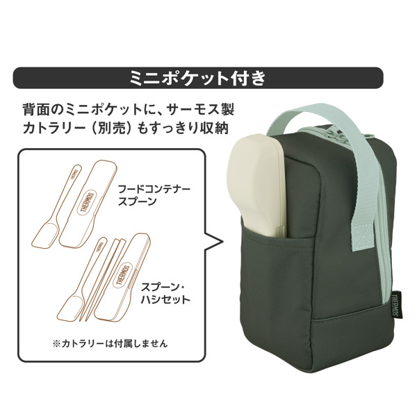 背面にはミニポケットが付いており、ちょっとした小物やカトラリーを収納出来て便利です。別売りのサーモス製カトラリーもすっきり収納することができます。