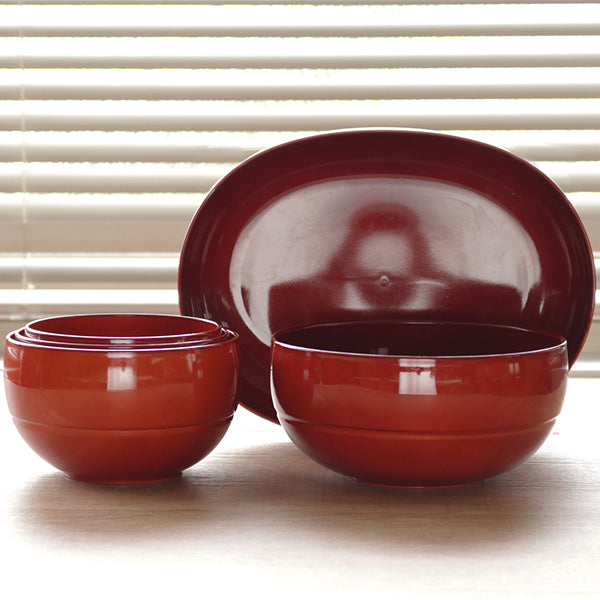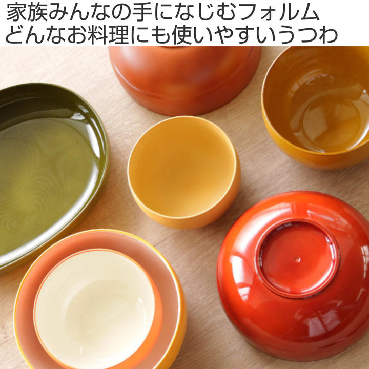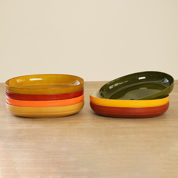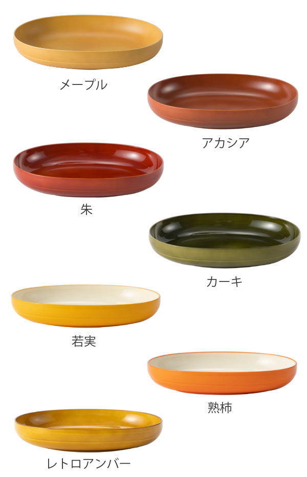 さらりとマットな質感の、メープル・アカシア。レトロな陶器のように艶やかな、朱・カーキ・レトロアンバー。会津の名産「みしらず柿」に由来し、お料理を瑞々しく演出するツートンカラーの、若実・熟柿。どれもお料理が映え、使い勝手の良いカラーです。