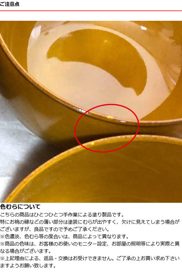 特にお椀の縁などの薄い部分は塗装にむらが出やすく、欠けに見えてしまう場合がございますが、良品ですので予めご了承ください。