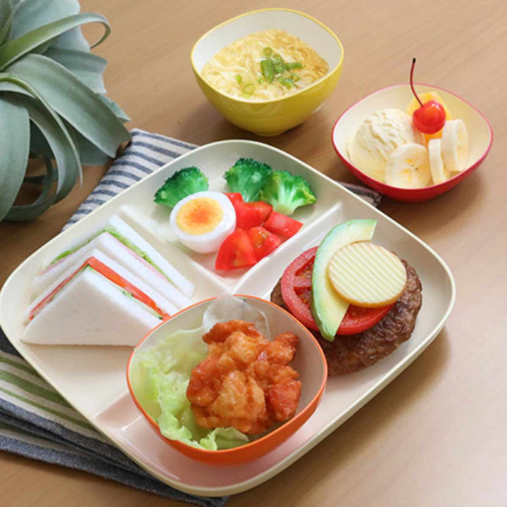 全体的につるりと艶があります。四角を基調としていて、重ねることが可能なので、食卓でも食器棚でもスペース効率が良いです。ワンプレートランチの食器としてなど、アレンジ使いにも最適です。