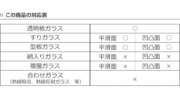 | 備考 | 使用できる箇所:透明板ガラス、すりガラス(平滑面、凹凸面)、型板ガラス(平滑面、凹凸面)、金属製ドアの平滑面 使用できない箇所:網入りガラス(平滑面、凹凸面)、複層ガラス(平滑面、凹凸面)、合わせガラス(熱線吸収、熱線反射ガラス等) ※温度変化でガラスが割れる場合があります(熱割れ現象) 木部・塗装面及び壁紙、屋外・浴室 使用期間:約6カ月 |