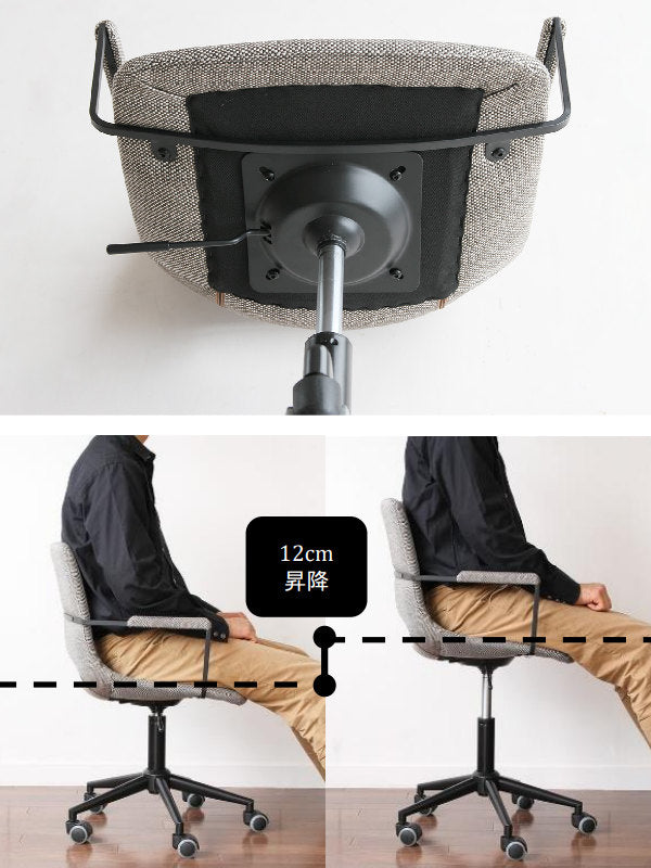 座面下にあるレバーを引き上げると、簡単に座る人やデスクの高さに合わせられ、お好みの高さに調節できます。高さは約12cm間で調節することができます。