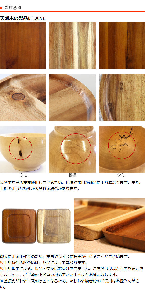 天然木をそのまま使用しているため、色味や木目が商品により異なります。また、上記のような特性がみられる場合があります。