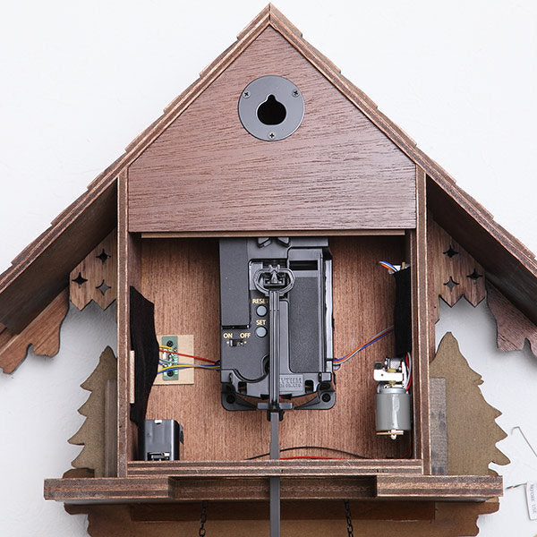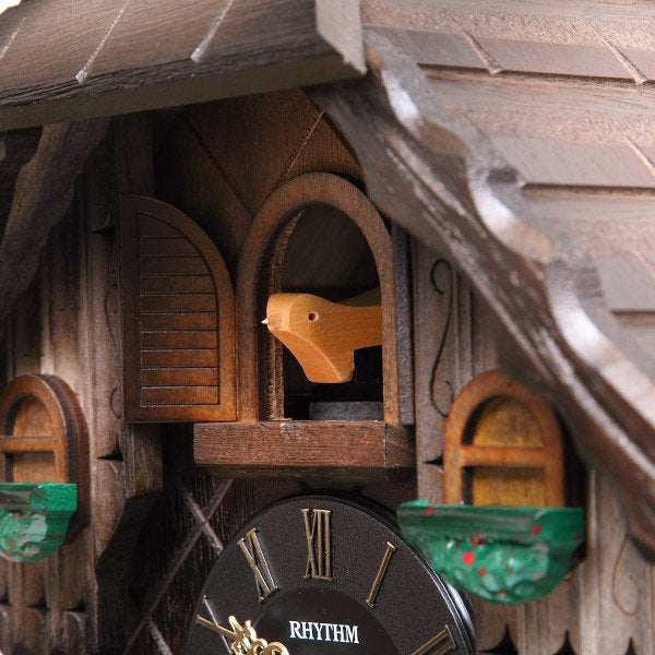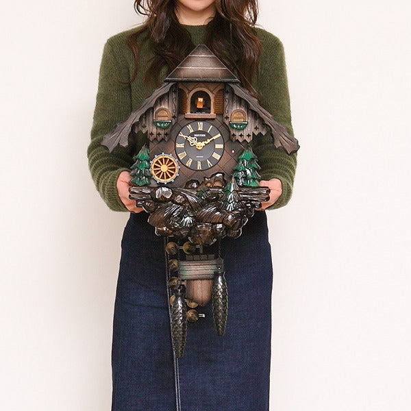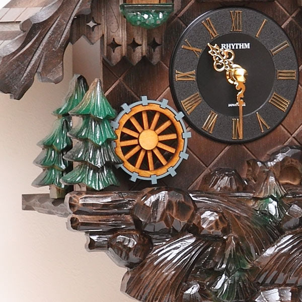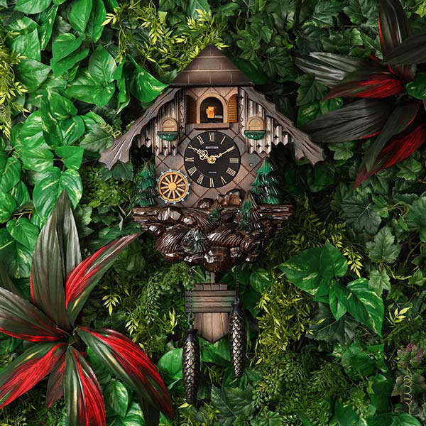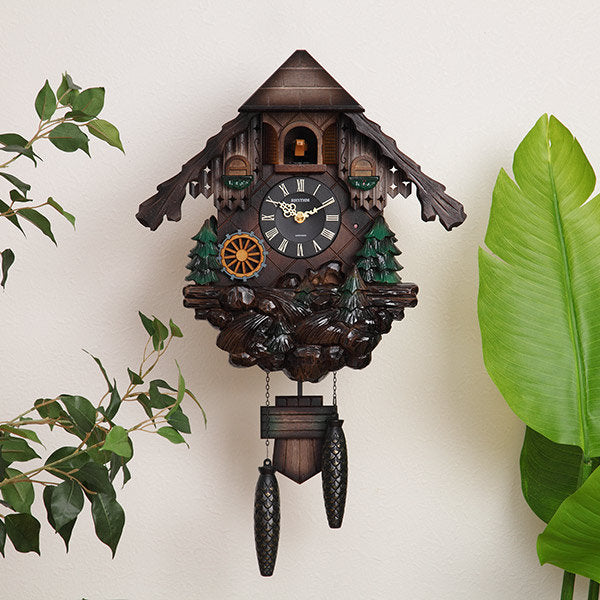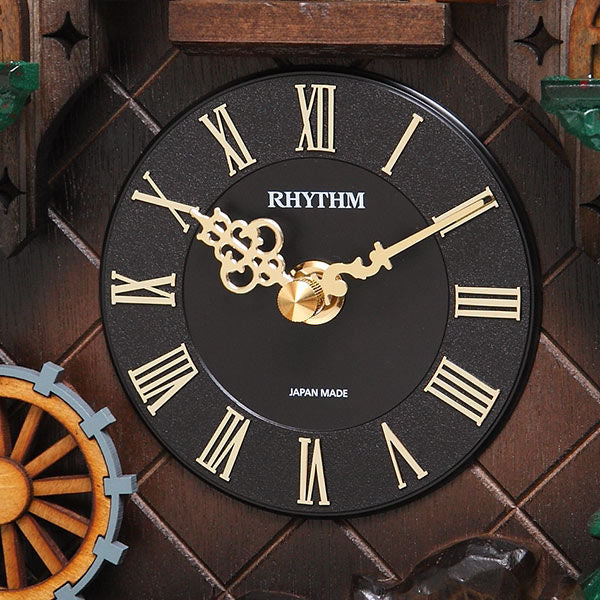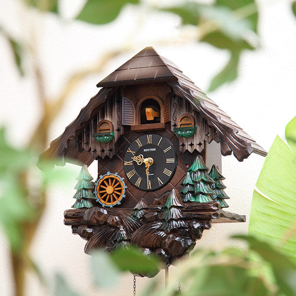 毎正時になると、カッコーが時間の数だけ鳴きます。報時音の後、オルゴール曲「美しき青きドナウ」が約15秒間流れるのに合わせて、本体左下の水車が時計回りに回転をします。ふいごの温かみのある自然な鳴き声と情緒あるオルゴールの音が響き渡り、この時計の世界観をより引き立てます。通常は扉を閉じ、カッコーは見えていません。また暗くなると明暗センサーが反応して報時を停止させます。