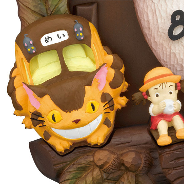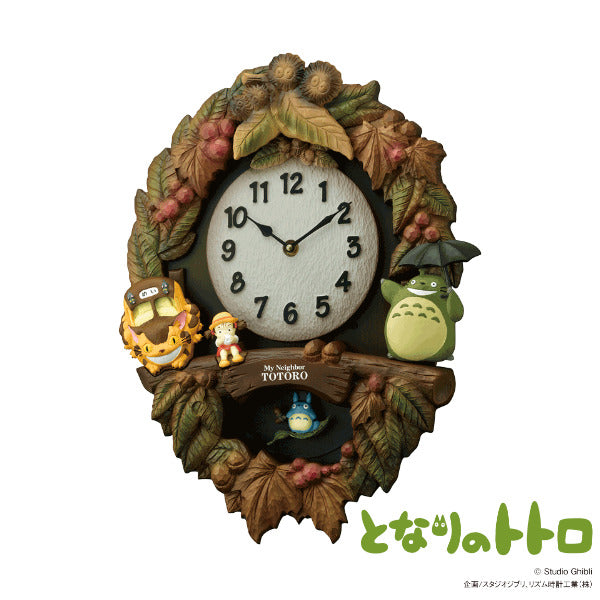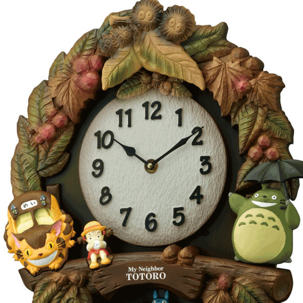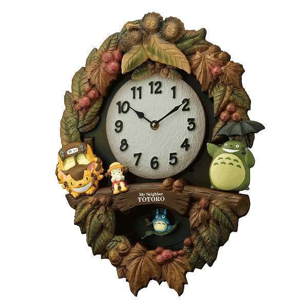 毎正時に中トトロがゆらゆら揺れながら「となりのトトロ」のテーマソングのオルゴールが流れます。また暗くなると報時が停止する明暗センサーが付いているので、周囲の明るさを感知して暗いと判別したときに報時を停止させます。(昼間や夜間照明時でも明るさが不足すると、報時をしなくなります。)