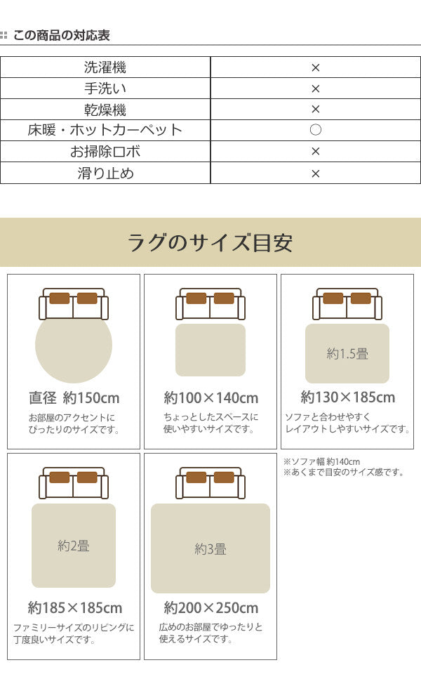 ホットカーペット、床暖房対応 ホットカーペット、床暖房に対応しているので、寒い冬でも温かく過ごせます。また、夏場はエアコンの冷えから守り、年中活躍するラグになっています。 |
