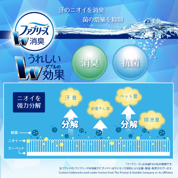 臭いが発生する原因は、生活の中に数多く存在しています。ファブリーズライセンスを取得したカーペットは、糸へ特殊加工により汗臭、部屋干し臭、ペット臭、排泄臭などの臭いを強力分解します。不快な生活臭の消臭に効果を発揮し、快適でクリーンな環境と安らげる空間が生まれます。